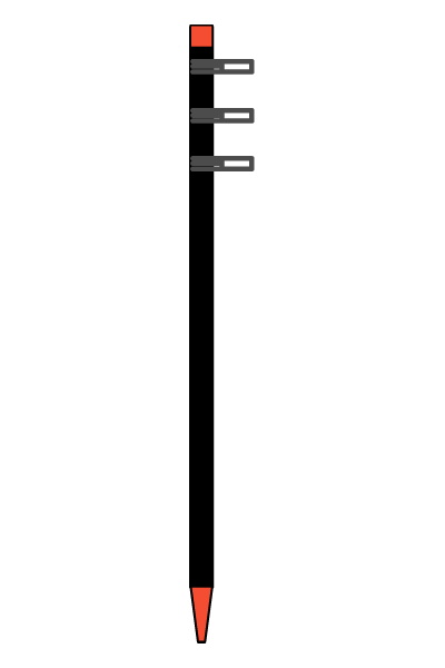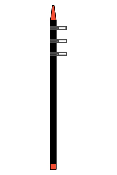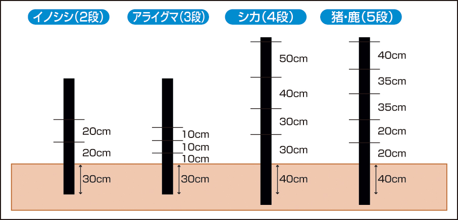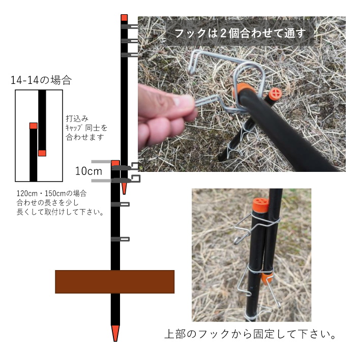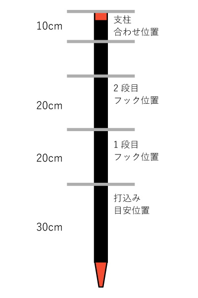 ②支柱に目安ライン(打込位置・フック位置)を入れてフックを付けます(倉庫などの涼しい所で作業して下さい)。下記の動物別柵線の高さを参照下さい。 |