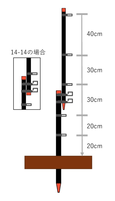 ③支柱を目安ラインまで打込みます。地面の固さで打込みやフックは微調整してください。(柵線を張った際に地面に対して水平になるように地形に合わせて支柱間隔を調整します) |