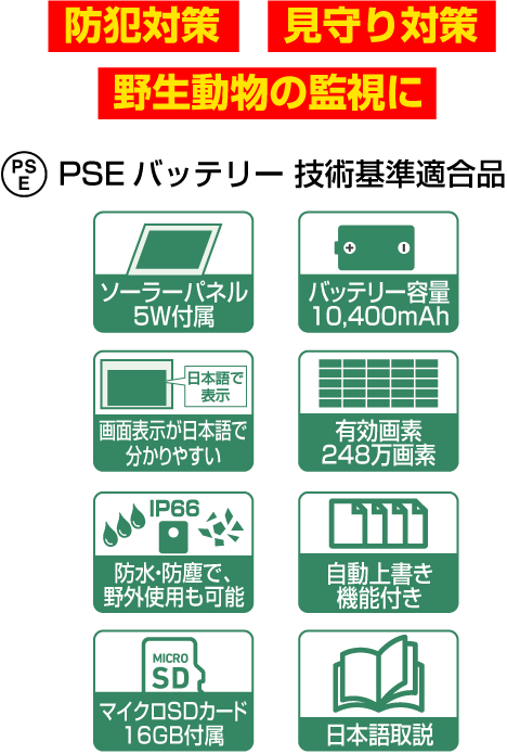 カメラ本体…1台/リチウム電池2600mAh…4個/アンテナ…1本/microSDカード(16GB)…1個/取り付け用具…1セット/日本語取扱説明書…1部